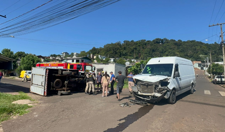 Um caminhão tombou após uma colisão com uma van na manhã desta quarta-feira (22), por volta das 10h, no cruzamento das ruas José Bonifácio e São Francisco, no bairro São Miguel, em Francisco Beltrão.