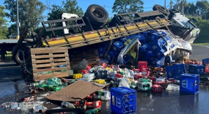 Devido ao tombamento, a carga de bebidas caiu sobre a pista, provocando a interdição de uma das faixas de rolamento.