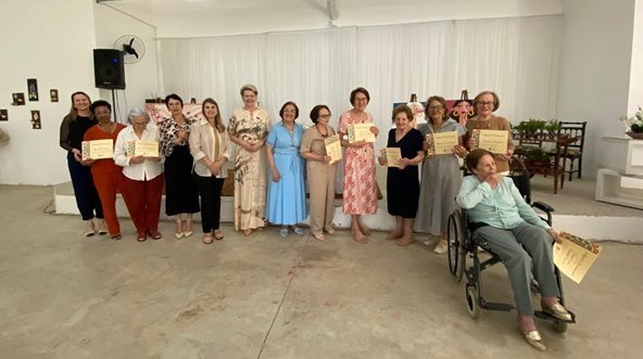 A programação artística incluiu momentos de grande sensibilidade com a atriz Cristina Particheli, colaboradora da Secretaria da Mulher, que declamou a poesIa “Arte de Ser Feliz”, de Cecília Meireles, emocionando as participantes.