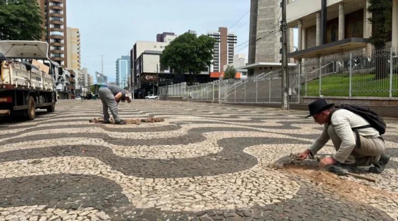A Zeladoria Urbana de Francisco Beltrão está trabalhando na recuperação do pavimento do calçadão central, espaço considerado um patrimônio do município pelos desenhos que remetem ao calçadão de Copacabana, com pedras em petit-pavé.