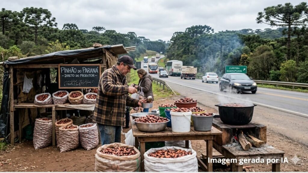 A temporada de comercialização de pinhão no Paraná está em andamento e traz um alerta importante sobre segurança viária. O produto é vendido frequentemente às margens das rodovias, junto aos acostamentos, criando situações de risco para vendedores ambulantes e motoristas.